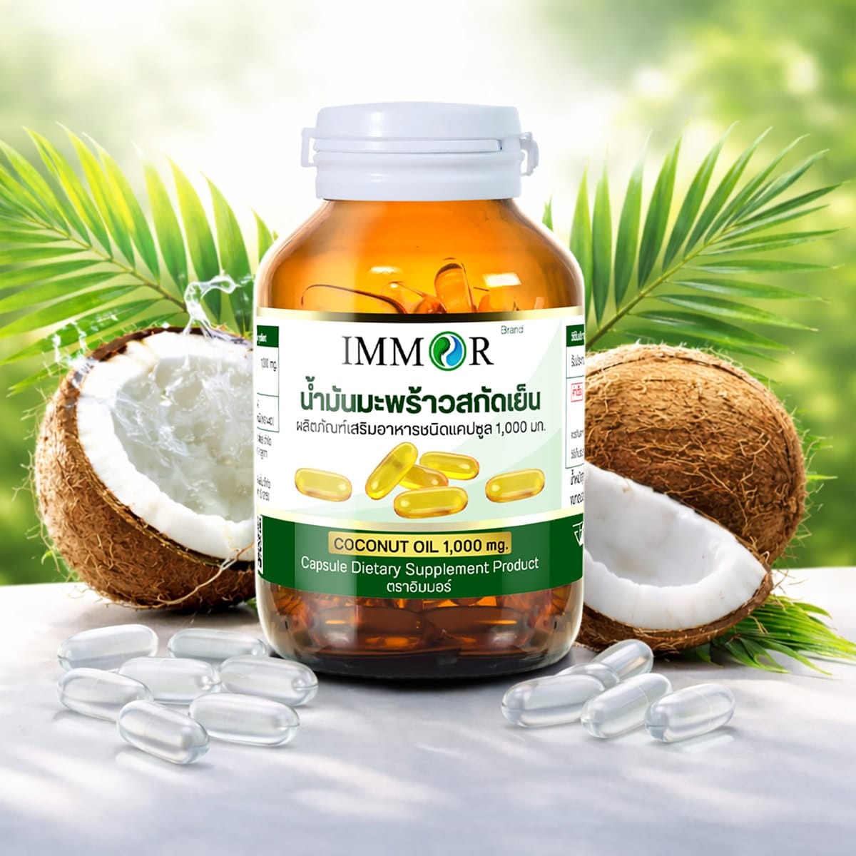 Coconut Oil Capsule แบรนด์ IMMOR+ คงคุณค่ากรดไขมันสายกลาง (MCTs) และวิตามินตามธรรมชาติไว้อย่างครบถ้วน ด้วยเทคโนโลยีการสกัดแบบ Centrifuge ใสสะอาด หอมละมุน ปราศจากสารเคมี 100%